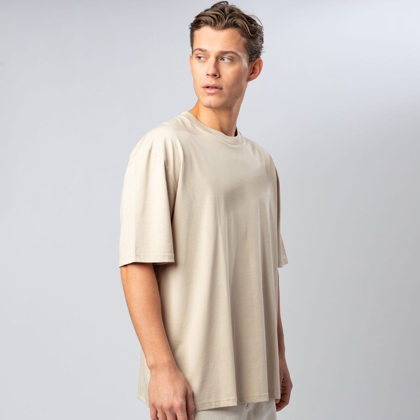 Genderless oversized crew-neck T-shirt with a relaxed and modern look, short sleeves, side seam construction, double layer rib neckline, shoulder-to-shoulder reinforcement tape for durability.